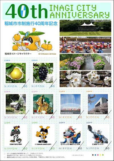 「市制施行40周年紀念郵票」除了大河原先生親手設計的「高達」和「狗俠汪汪」等角色的圖樣外,繪有稻城市風景和農産品等圖樣的限量郵票,也正於市内郵局限量1,500套發售中。