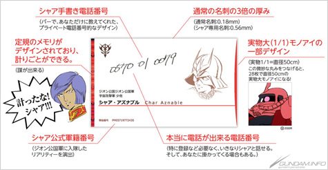 擁有一般名片3倍0.56mm厚度的夏亞名片,除了印有能夠和夏亞通話的專用回線號碼外,邊框設計成尺規能夠進行「測量(=算計)」,還設計成為「實物大小薩克眼」的一部分等等,附有多種有趣機能!