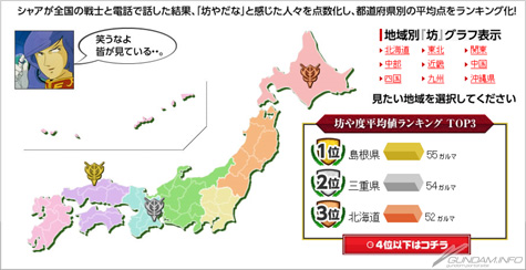 這裡有夏亞和全國戰士通過話的結果,將感覺『只是個少爺啊』的人們數字化,以各都道府縣的平均分數排成排行榜。現在「孩子氣」全國第1名為島根縣,但是這到底是一件光榮的事嗎,還是…??