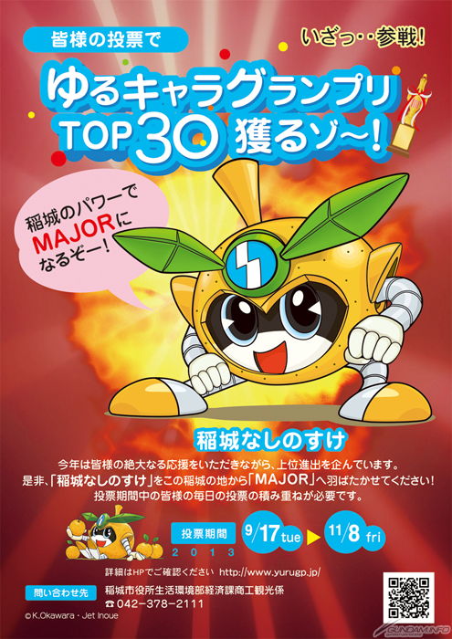 9月17日より開催中の「ゆるきゃらグランプリ2013」に、大河原邦男氏がデザインを手がけた東京都・稲城市のイメージキャラクター「稲城なしのすけ」が参戦することが発表された。