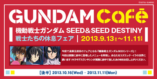 活動於「秋葉原店」、「東京車站店」、台場「東京台場購物廣場店」全店實施,期間中將會販售『機動戰士高達SEED』與『機動戰士高達SEED DESTINY』相關的餐點、飲料。後半部菜單分別為秋葉原店的「智慧女神號艦内餐22」、東京車站店的「大天使號艦内餐26」、東京台場購物廣場店則會供應以真為主題的現烤三明治等,追加各式各樣的全新餐點。