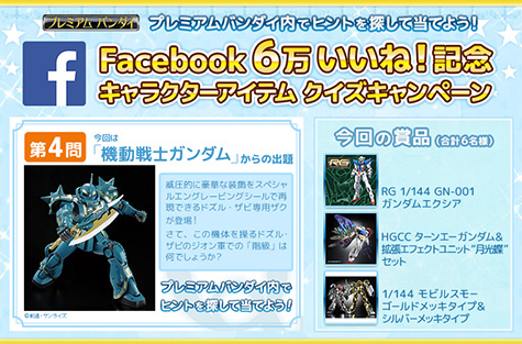 本活動是為了紀念「PREMIUM BANDAI Facebook 粉絲頁」在去年12月達成6萬個讚!而舉辦,只要回答出Facebook上人氣角色周邊商品相關的問題,就有機會獲得豪華獎品。