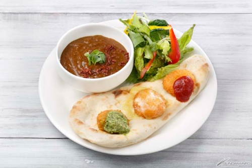 附有口感軟呼呼的印度烤餅與香腸的起司咖哩,毫無疑問是必點料理!