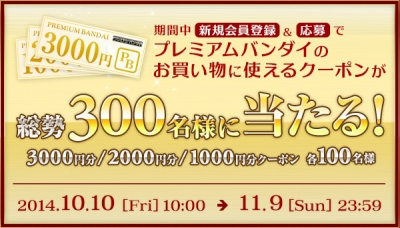 只要在活動期間中,註冊成為PREMIUM BANDAI的新會員,並透過報名表申請參加抽獎活動,就有機會抽中可在網站內消費時抵用的優惠券,合計共有300個中獎名額。優惠券有3,000日圓等值・2,000日圓等值・1,000日圓等值等3種,每種皆有100個中獎機會。