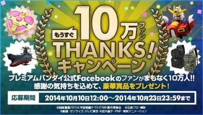 BANDAI官方購物網站「PREMIUM BANDAI」,為了紀念官方Facebook即將獲得第10萬個「讚!」,開始舉辦能抽中高達系列作以及「宇宙戰艦大和號2199」等人氣商品的優惠活動。
