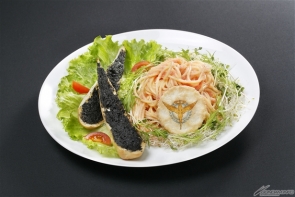 附有印上「天上人」標誌的起司。炸白肉魚&塔塔醬代表的形象是「刹那」、紅蘿蔔是「阿雷路亞」、萵苣是「洛克昂」、菊苣則是「提耶利亞」。