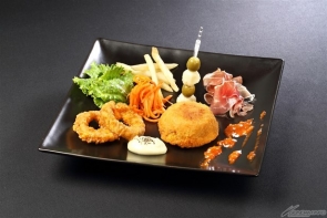 【右】會戰前夜的小巷子~番茄&羅勒的米可樂餅・炸花枝圈・生火腿・橄欖和起司的串物~ 價格:1,080日圓(含稅)