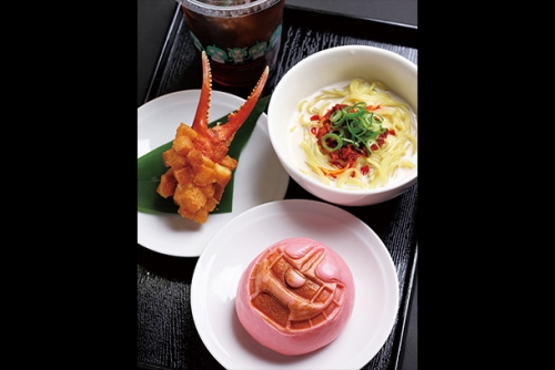 「高達飲茶套餐」裡有肉包、湯麵、芝麻團子、烏龍茶。「馬沙專用渣古飲茶套餐」則有豆沙包、豆漿担担麵、炸蟹爪、烏龍茶。價格皆為1,080日圓(含稅)。