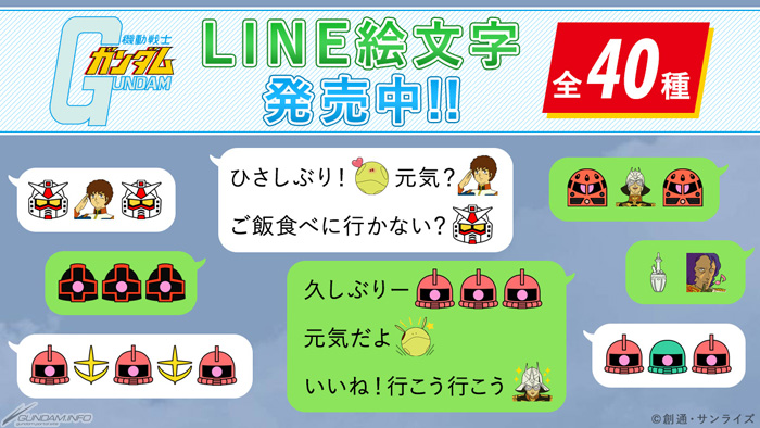 『機動戰士高達』的LINE表情貼,現正於通訊應用軟體「LINE」内的貼圖小舖好評上架中。價格為1組100 LINE COIN(含稅240日圓)