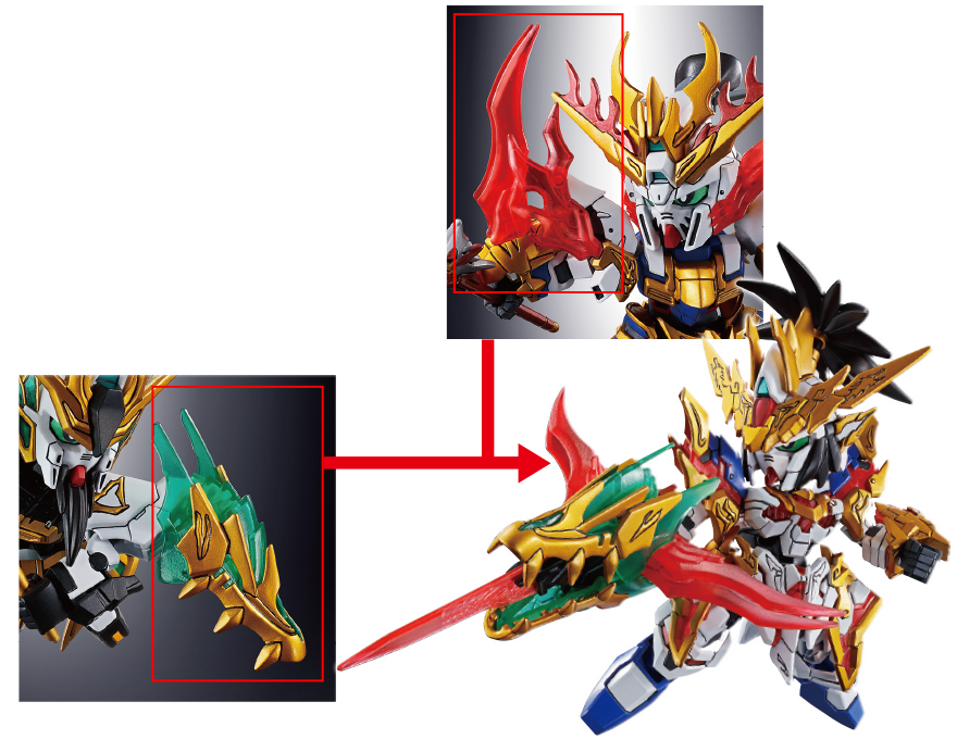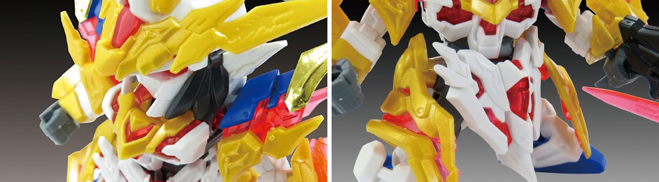 相比過去系列更加進化,藉由講求比例和分件,只要組裝完成就能重現SD高達史上最頂級的分色。採用大量透明零件所組成,只要少量的貼紙,簡簡單單即可組裝出帥氣的武將們。