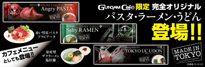 伴手禮麵種類有,以馬沙專用渣古為概念的香辣番茄筆管麵「MS-06S ZAKU II Angry PASTA」、以渣古為概念的鹽味拉麵「MS-06F ZAKU II Salty RAMEN」、以實體大獨角獸高達立像為概念的烏阿龍麵「RX-O UNICORN GUNDAM Ver. TWC TOKYO UC UDON」3款。價格為一包400日圓(未稅)。