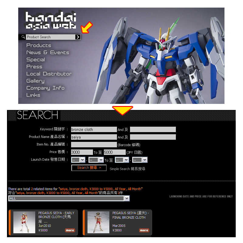 http://www.bandai-asia.com/已可支援部分商品的中文繁、簡體或日文關鍵字, 包括兩岸三地的作品及角色名稱等不同版本, 仍在不斷更新中!!