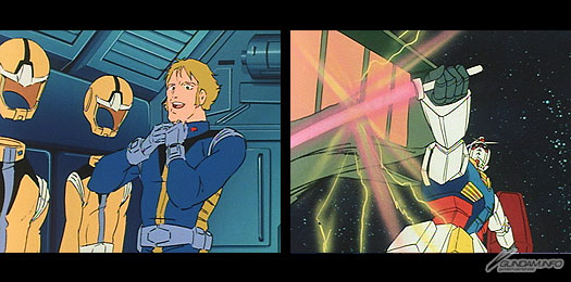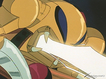 被放棄的機動裝甲,渣古尼羅單挑白色基地。在機動兵器之中大放異彩的獨特設計是意外的強敵。這次足部套上G裝甲戰機B組件的高達也登場,本來高達的機體只能正面組裝、這次則改為逆向組裝。是只有這回出現的特殊合體。