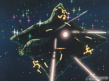 足以窺見吉翁公國物資困乏的情形。雖然只是在小行星上加裝推進器的質量兵器,卻能在宇宙空間裡造成嚴重的傷害。