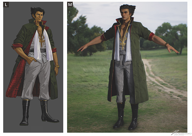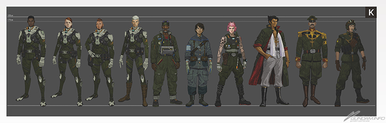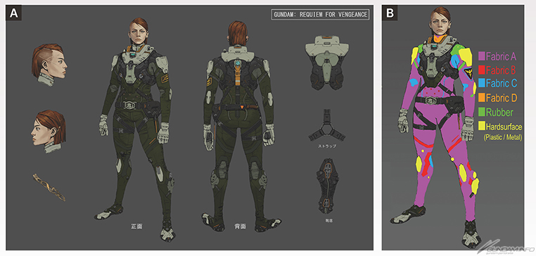 L:尤里・克拉里的部分設計畫、M:完成模型。尤里的製作由後藤美沙擔任,建模則以Maya進行。由於尤里也曾在『機動戰士高達 第08MS小隊』中登場,為了在維持原本形象的同時,和本作的其他角色放在一起也沒有異樣感,莫拉在設計畫階段不斷地進行調整。「風格的方向性在索拉里以及其他角色的建模中已經確定,因此希望以相同方向來製作尤里,但是最初的結果總覺得不合適。經過與 布羅斯達導演及 BNF 的討論,我們在髮型和臉部造型上做多次調整,直到截稿前仍不斷地進行嘗試和修正」(藤田)