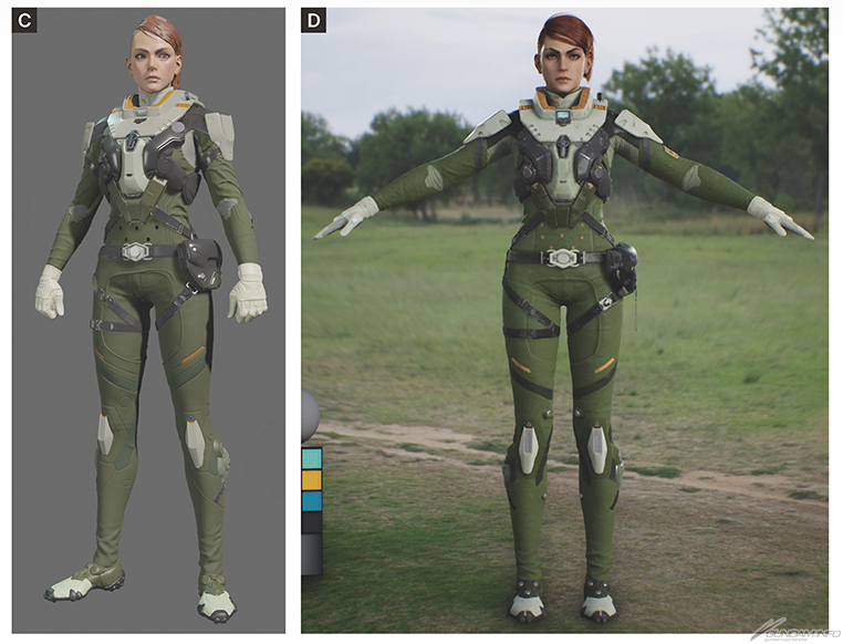 B:為了減少數據量並表現高解析度的細節,將多種不同材質的法線貼圖以平鋪方式應用。蘇拿利的臉和上半身等使用了7張的4K材質,各材質貼圖可以使用四種(RGBA通道)的法線貼圖