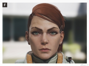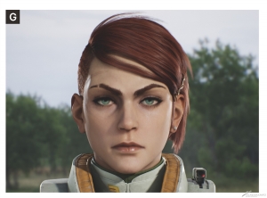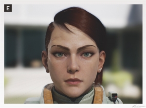 另外,蘇拿利的頭髮在草圖模型階段由藤田先生以多邊形表現,後期則由獨立髮型專家 Johan Lithvall 利用 Maya 的 XGen 技術替換,並將生成的曲線導入 UE 進行渲染。表情方面則使用 FACEGOOD 技術,因此建模階段特別重視鼻唇溝和額頭皺紋的位置。