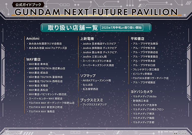 「GUNDAM NEXT FUTURE PAVILION」官方指南將於7月中旬起在AmiAmi、Yodobashi Camera等商店和線上購物網站發售。 價格為3,850日圓(含稅)。