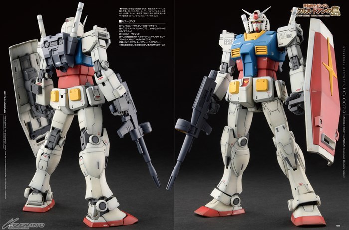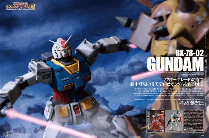 範例作品使用的「MG RX-78-02 高達(GUNDAM THE ORIGIN版)」,由於本體的細節再現了有部分差異的前期型,便修正與中期型的形狀差異。塗裝重視著質感,使用了漸變塗裝集輕微的舊化呈現出使用感。完成了更接近劇中形象「RX-78-02 高達」。