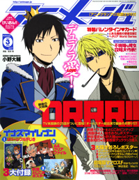 「ANIMAGE」三月號再度登上封面的是「無頭騎士異聞錄」臨也&静雄的雙人組合! 兩人的特別打扮保證讓身為粉絲的你雙眼為之一亮♪,之所以他們成為本期的封面呢,是因為2月23號發售的DVD最終卷vol.13,收錄了在電視上未播出的故事第25話「天下泰平」的關係,所以在本期再度的大推「無頭騎士異聞錄」喔☆ 強行採訪大森貴弘監督,25話的祕密即將揭曉。還有,潛入豊永利行&花澤香菜主持「無頭騎士異聞錄」的廣播節目,收錄兩人的自白對談。也刊載了神谷浩史&小野大輔的特典照片,主要角色的總登場大特集展開中唷☆附送 帝人・杏里・臨也・静雄4人穿著黑西裝的海報喔☆ 這就是「無頭騎士異聞錄」最後的祭典!