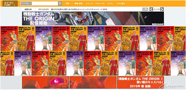 綜合電子書籍商店「BOOK☆WALKER」上為了紀念「機動戰士高達THE ORIGIN」的電子書上架,現在正舉辦只要購買第1集到第3集中的任一本書,就會贈送「GUNDAM ACE漫畫總合目錄2014(電子版)」的優惠活動。活動期間到9月25日(四)為止。