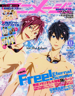 「Animage 11月號」的封面,是最後一集餘韻尚存的『Free!‐Eternal Summer‐』的遙&凜!原畫是負責角色設計的西屋太志☆ 兩人被在花期外綻放的櫻花包圍,是粉絲就馬上明白,這意思就是浮在「櫻花的游泳池」♥
