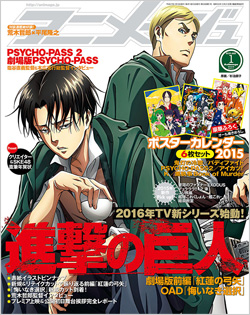已經來到年底了呢~。登上「Animage 1月號」封面的,是熱映中的『進撃的巨人』裡的里維&艾爾文。兩人之間的氣氛相當耐人尋味呢♥ 刊頭也有詳細的大特集! 就先透過全新&重繪的場景截圖來回顧劇場版前編「紅蓮的弓矢」。荒木哲郎監督的超長訪談也是不容錯過!特別上映&’上映首日的舞台問候也有完整報導。只要讀了Animage,就一定會想去電影院看!