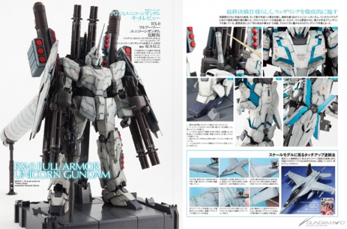 接續前號內容,徹底探討2014年底的最受矚目商品、「PG 獨角獸高達」! 這次使用在本體發售同時開始受理訂單的「PG 1/60 RX-0 獨角獸高達用FA擴充組」,刊載「全裝甲獨角獸高達」。當然,獨角獸的本體也是全新製作。用精神感應框架閃爍翡翠色光芒的“覺醒版”,假設是在激戰後,受損的情況,以風化完工的方式完成。