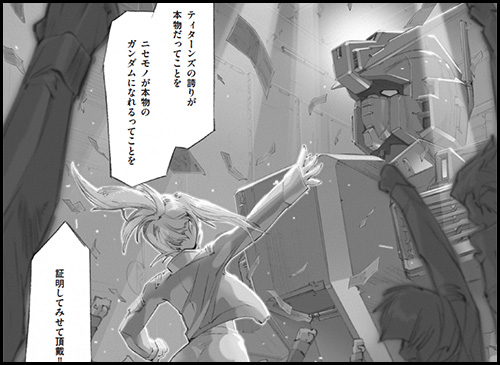 ▲作為複製人士兵求生的水野,將自身遭遇和換上高達頭的「吉姆・鎮暴型」(海茲爾初期型)重疊。“贗品”究竟有沒有辦法成為“真品”呢?