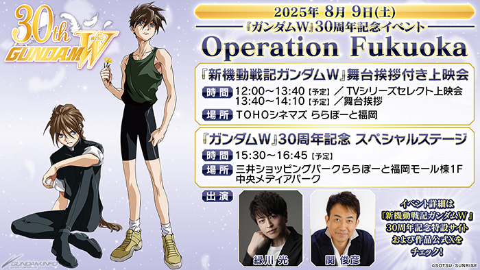 TOHO Cinemas LaLaport 福岡將舉行舞臺問候新機動戰記高達W screening,LaLaport 福岡將在 LaLaport 福岡購物中心大樓 1 樓的中央媒體公園舉辦“高達W 30 周年特別舞臺”。
