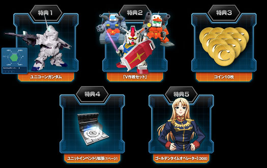 活動期間中只要購入推薦的PC,就有機會獲得最新機體「獨角獸高達」、高達、鐳射大砲、太空坦克一整套的「V作戰SET」,更有「金幣10枚」增加保有機體為6機等「倉庫(機體在庫)擴張」、「黃金時間通訊官I(30日使用權)」都有SET特典。