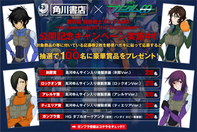抽獎活動是為了紀念在9月18日(六)即將公開的「劇場版 機動戰士00 -A wakening of the Trailblazer-」而舉辦,收集角川集團所發行的高達00關連的指定書籍書腰上所附贈的應募卷2張寄出參加應募,即有機會可抽中高河弓老師的高達駕駛員複製原畫(含簽名)、最新高達模型「HG 1/144 量子型00」等豪華獎品,合計共計100名可以得到獎品。應募截止日期為10月31日(日),當