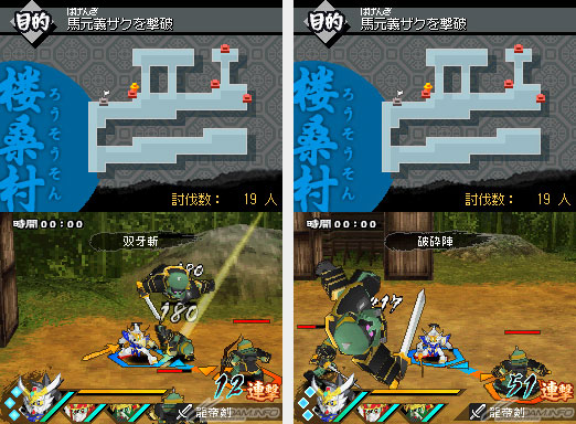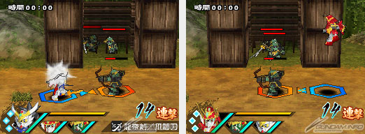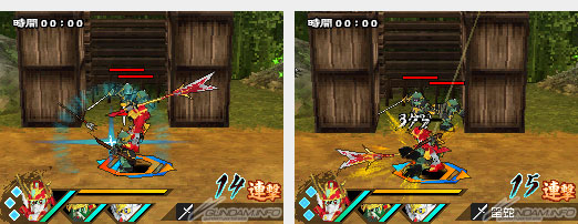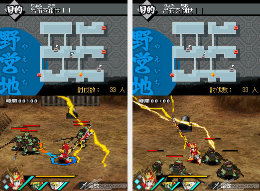 任務最多可有3人武將組成一對挑戰。 戰鬥中可以用L鈕切換出撃中的武將,因應戰況或是敵人的屬性有效率攻略關卡。