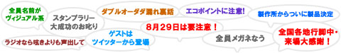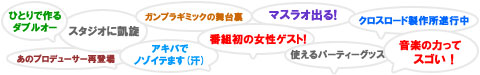 本週的手機廣播是? 手機版播放「聽眾回函收穫祭」。意外地準!?介紹尖兵的姓名判斷結果,以及令人意外的「那個人」寄來的驚奇信件! 也刊載了公開錄音舞台的附照片報導,請務必一看。 |