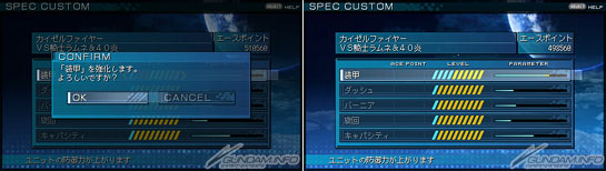 ▲從Intermission選單的「機體改裝」選擇要強化的機體,再選擇「機體強化」就會移至參數強化畫面。對想強化的項目輸入強化等級,所需的ACE POINT就會顯示在「COST」上,並且視多寡而亮燈。