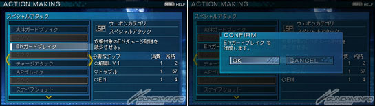 ▲製作特裝動作,在Intermission選單的「司令部」、「特裝動作作成」進行。平常會顯示為「???」,不過收集到必要的晶片時,特裝動作名稱便會完整顯示。