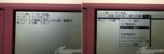 ▲也搭載了QR CODE變換機能,輸入的文章可輕易的傳送到手機。用Pomera寫文章,用手機發送MAIL、投稿到BLOG、twitter等等都相當方便。對於不習慣使用手機打字的人來說是相當便利的一品。