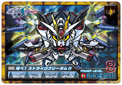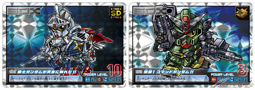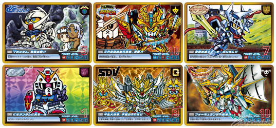 精選六個SD高達世界:“SD高達”、”SD戰國傳”、”SD高達外傳”、”SD司令戰記”、”SD騎士傳”、”GUNDORA”當中出現的角色,並包含20個以上新繪製的角色在內,收錄全72個角色,由21張「閃卡」與51張採用燙金邊框的「普卡」所組成。