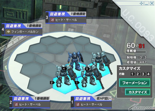 另外,使用原有的部隊陣形時,也如往常一般會依據部隊陣型在各機體狀態表上顯示使用此陣型時的獎勵點數,不論是新手或是懶得進行各種細部設定的人都可以簡單地進行遊玩哦。
