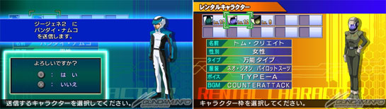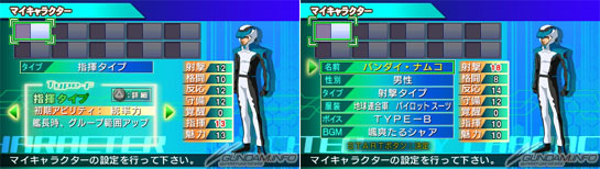 本系列初次開放這項機能,對於“射撃”或“格鬥”等等個人偏好可以選擇對應的角色基本能力資訊,除了「成長類型」之外,「姓名」、「性別」、「服裝」、「語音」,甚至連「戰鬥時背景音樂」都可以進行編輯,擁有大幅度的自由調整空間。