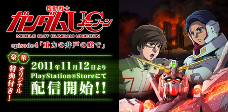 11 月18日(五)開始,PS Home的「劇院(螢幕1)」上將分別進行episode 1~3的一夜限定,免費上映活動以外,在12月25日(日)之前針對使用PS3®購買episode 4的全員,將會獲得「Original Dynamic Custom Thema」,並再抽出5,000名幸運兒,贈送禮物Home reward「RX-0 UNICORN GUNDAM」。