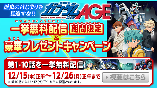 配送期間限定至 12月26日(一)中午為止,千萬別錯過囉。另外,僅有第10話由12月17日(六)開始配送。還沒看過的觀眾們一定要趁這個機會好好欣賞『高達AGE』喔!