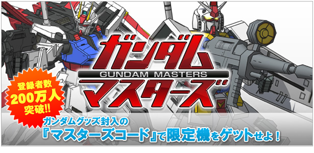 | GREE好評營運中的社交遊戲「GUNDAM MASTERS」上從發售中的「RG 1/144 RX-178 高達Mk-II(泰坦斯配色/奧干配色)」開始,將在各式各樣的高達商品中封入特典序號『MASTERS CODE』! 將「MASTERS CODE」輸入遊戲的活動頁面,就能挑戰入手各商品的限定機體轉蛋! 今後陸續發售封入「MASTERS CODE」的商品將在此一齊介紹! |