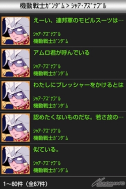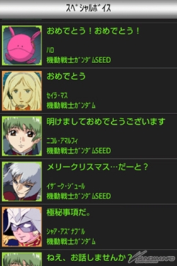 以『機動戰士鋼彈』為首,從鋼彈系列8部作品中集合100位以上的人氣角色,能夠享受2,000句以上作品中的名台詞以及只有在這才聽得到的原創語音等內容。下載的語音也可以作為來電鈴聲及鬧鈴聲來使用。盡情享受這些大量的語音吧!