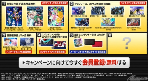 為了紀念即將在3月14日(四)發售的任天堂3DS用遊戲「超級機器人大戰UX」,與動畫發布服務「BANDAI CHANNEL」連動的「發售紀念6大特典活動」,將於2月5日(六)17:00起實施。