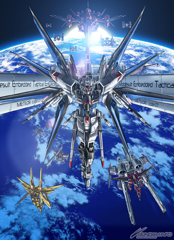 這次的主宣傳圖由本作機械作畫總監・重田智全新親筆繪製,跟「突擊自由高達」跟流星合體後面對最終決戰的精悍姿態、「無限正義高達」、「曉」、「大魔裝甲兵」都繪製在圖中,展現驚人魄力。