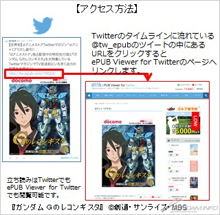 「d動畫+」利用能夠在Twitter時間軸上閱讀電子書的「epub viewer for Twitter」,是全球首部Twitter雜誌。除了可以直接從「d動畫商店」Twitter官方帳號( @docomo_anime)的「d動畫+」相關推文上直接閱讀外,也可以從同一篇推文所記載的超連結上看到。
