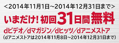 NTT DOKOMO提供的智慧型手機、平板電腦、電腦用服務「d Market」當中,「d影片」、「d雜誌」、「d HITS」、「d動畫商店」等4項定額制服務,正在舉辦首次註冊免費收視31天的優惠活動。