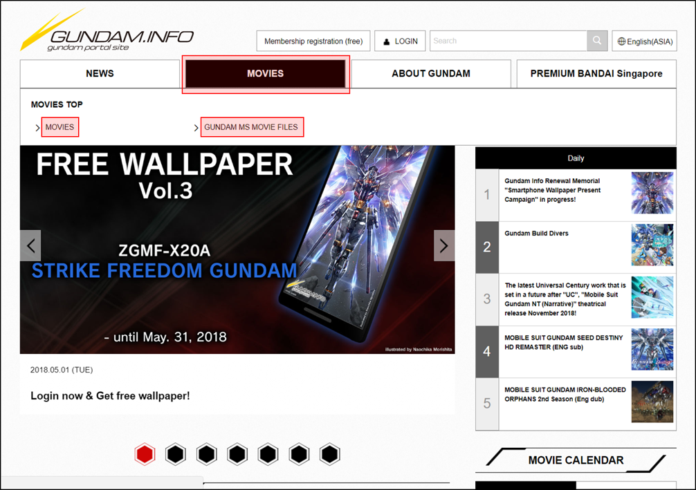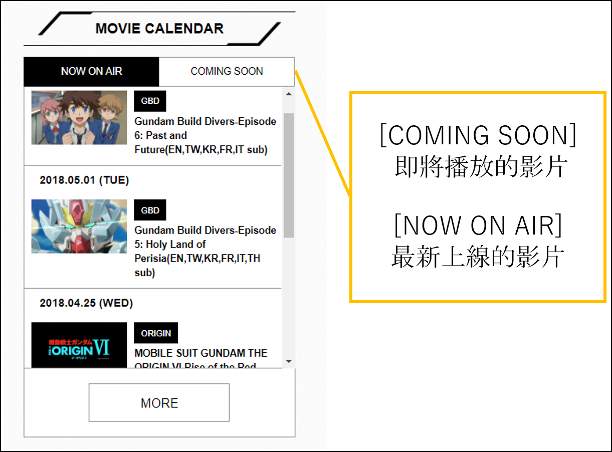 溫馨小提醒:GUNDAM.INFO首頁也設有【MOVIE CALENDAR】以供觀看最新上線的影片以及查詢即將播放的影片。